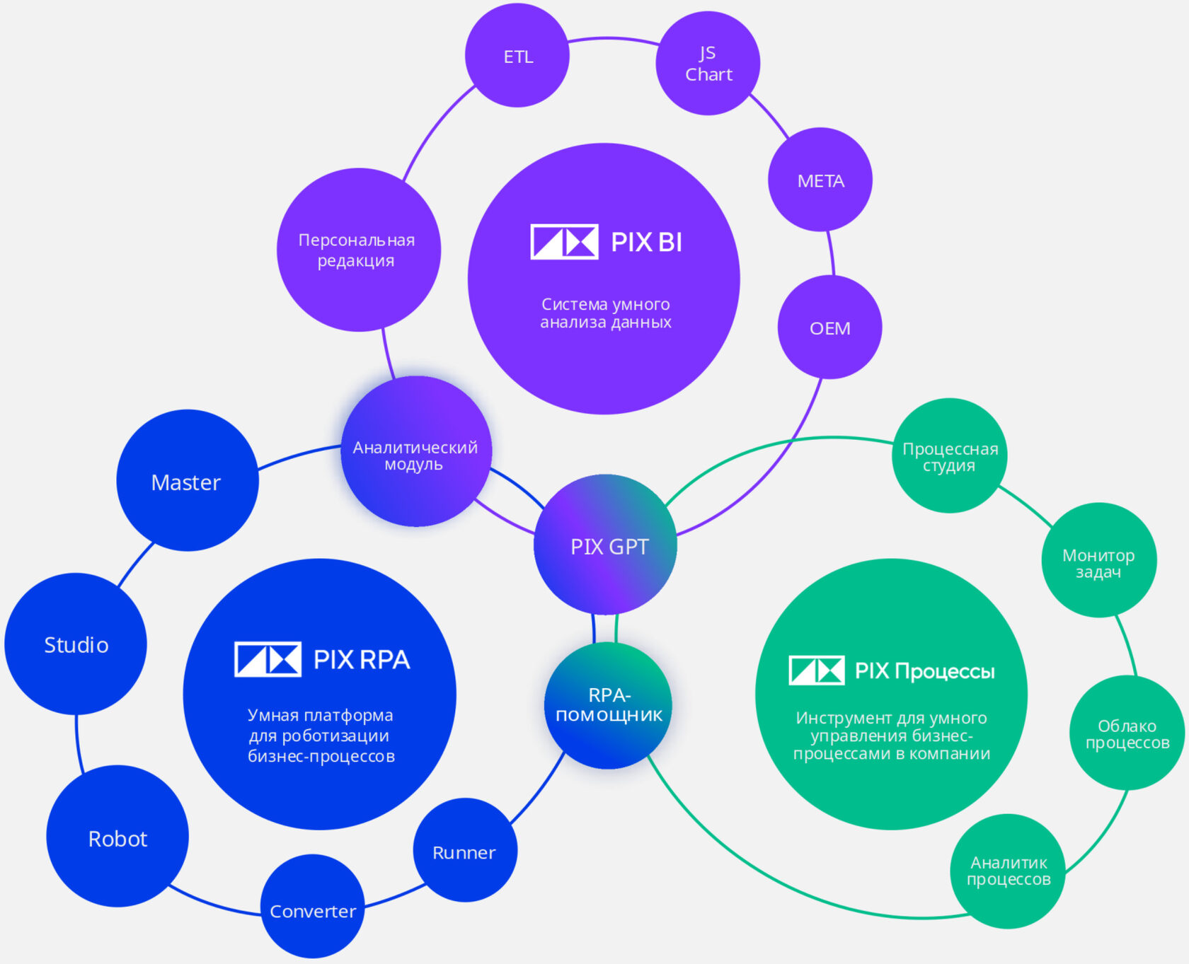 - PIX RPA - среда программной роботизации с элементами искусственного интеллекта. Позволяет автоматизировать комплексные бизнес-сценарии с помощью визуального конструктора или простых скриптов. Уменьшает объем рутины и повышает эффективность работы ваших сотрудников.